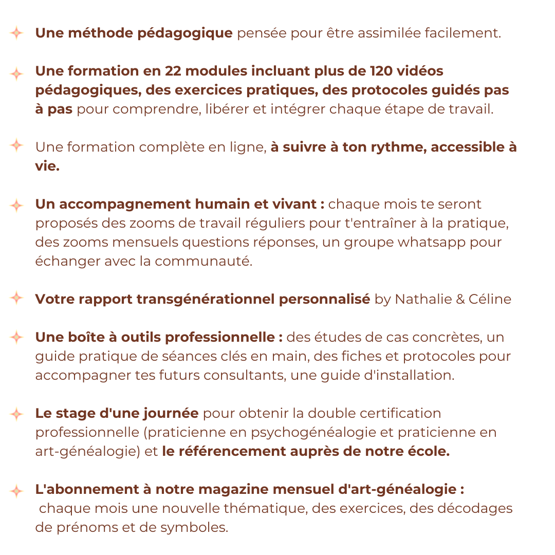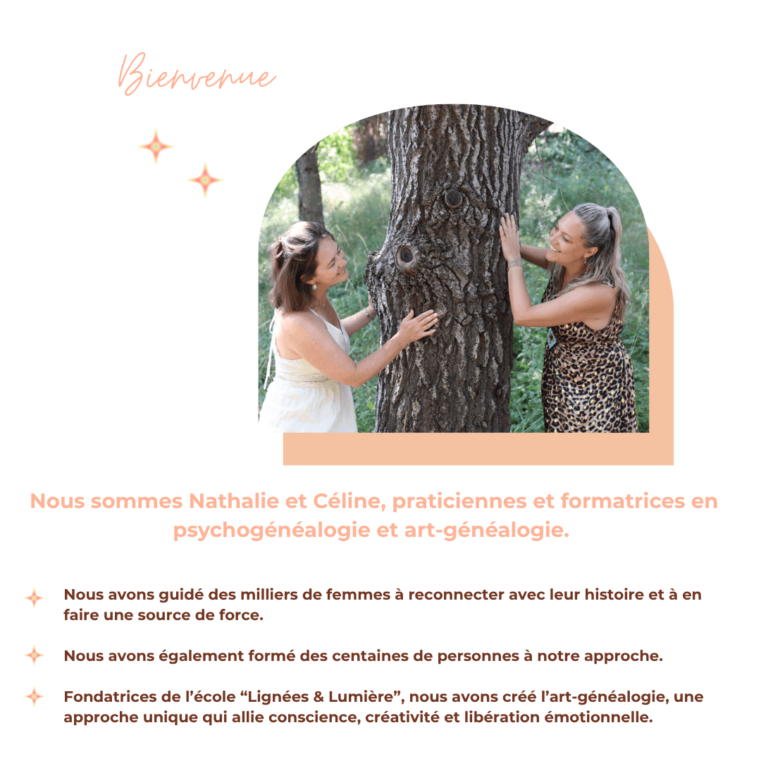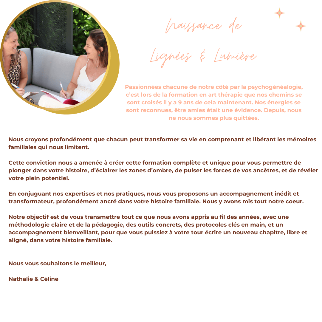 C’est cette alchimie des méthodes qui rend Lignées & Lumière unique : une formation qui transforme en profondeur, qui respecte le rythme de chacun, et qui te reconnecte à ton essence, ta lignée, et ta mission. Cette transformation tu la vis, pour ensuite pouvoir la transmettre à ton tour et accompagner si le coeur t'en dit. Notre formation de praticienne en Psychogénéalogie et en Art-généalogie est unique et t'offre à la fois toute l'expertise nécessaire et un accompagnement humain et guidé pas à pas. Tu n'es pas seule, et nous prenons soin de chaque personne avec coeur et bienveillance pour que chacune se sente prête et légitime pour accompagner.