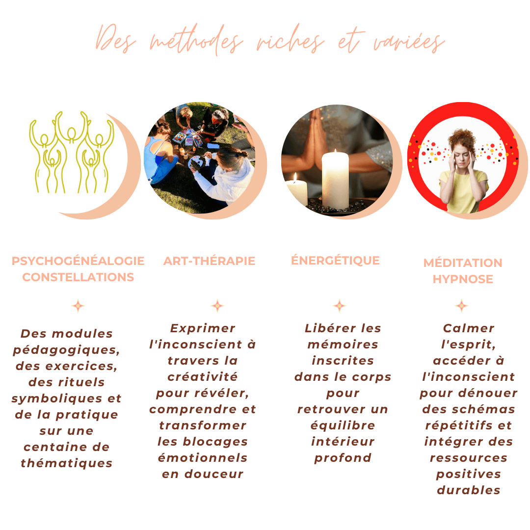 Nous allions l'analyse transgénérationnelle, la symbolique, le ressenti corporel, l’énergétique, l’art-thérapie, le décodage, les constellations, pour libérer en profondeur les mémoires inconscientes. Chaque outil vient soutenir une transformation à la fois émotionnelle, énergétique et symbolique. Nous sommes autant connectés au conscient pour celles et ceux qui ont beaucoup d'informations sur l'histoire familiale, qu'avec l’inconscient quand l'histoire reste inaccessible malgré les recherches.