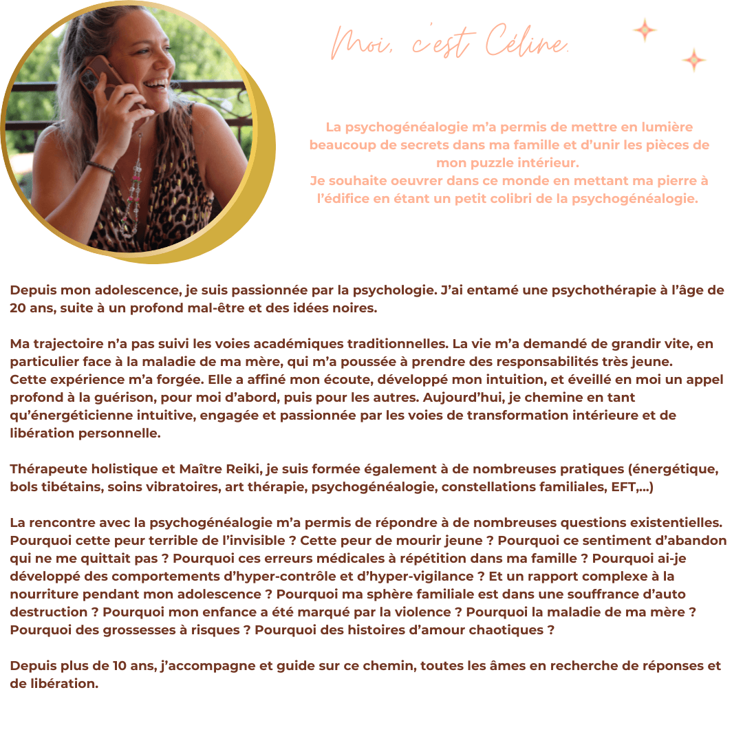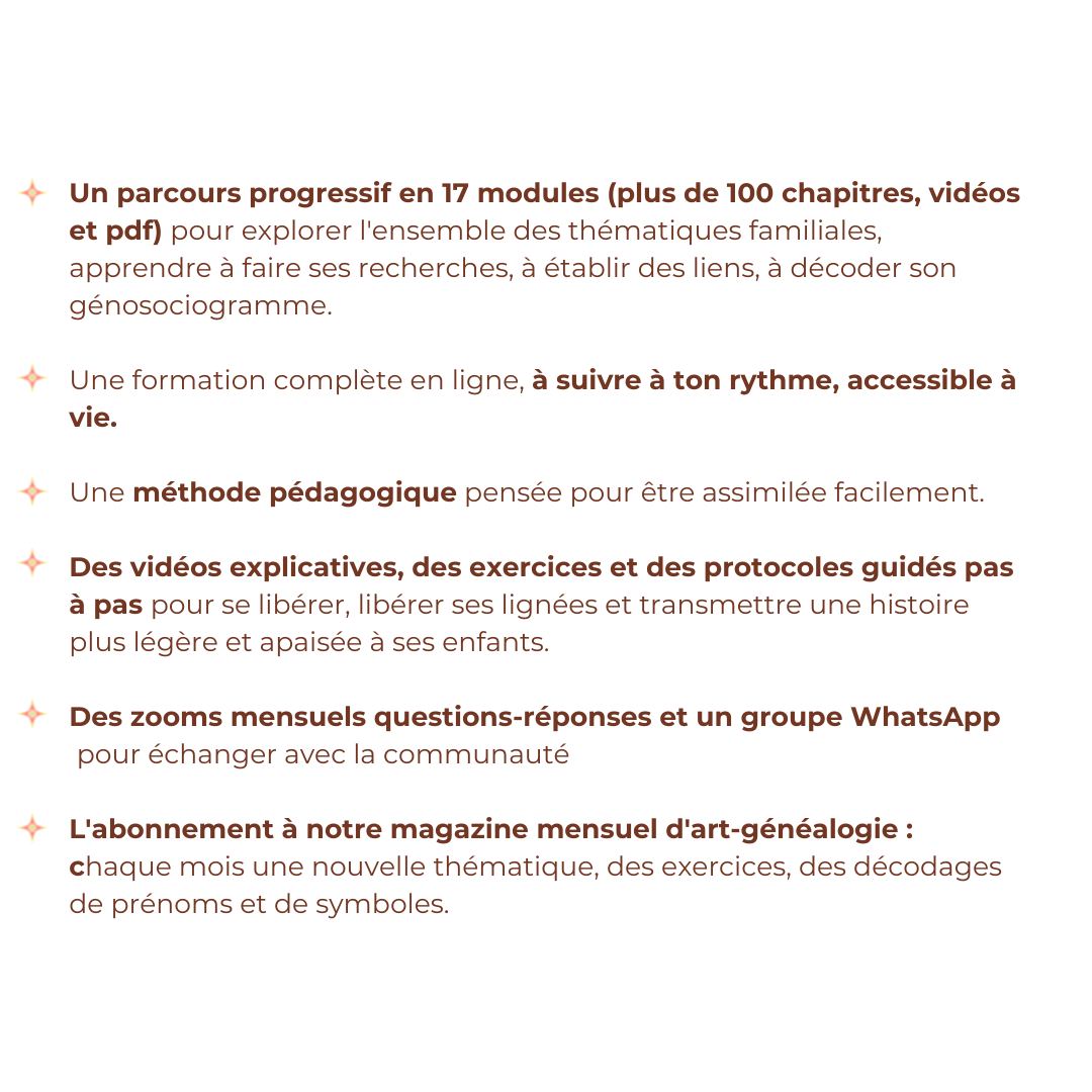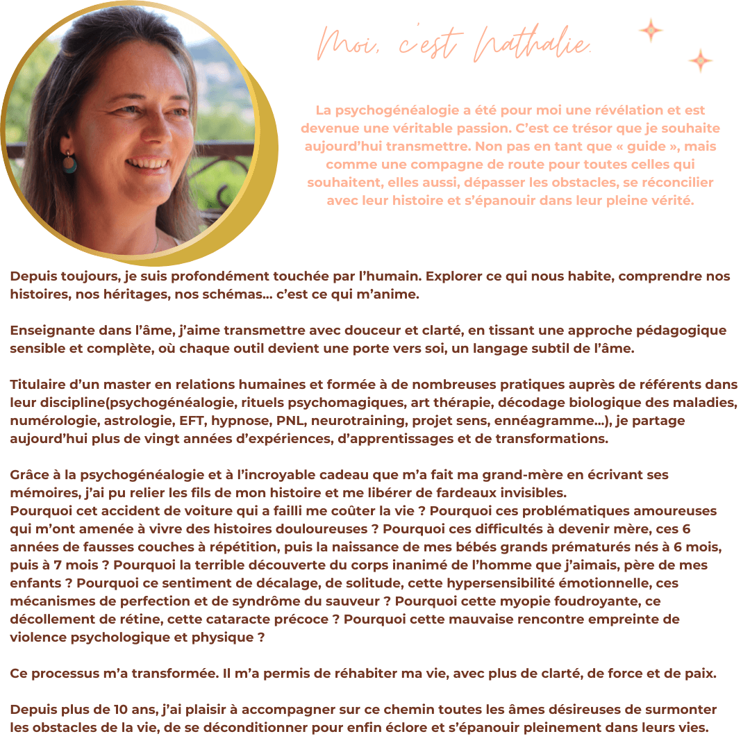 "L'accompagnement de Céline et Nathalie est une aventure formidable et pleine d'émotions ! J'ai commencé au printemps et en l'espace de quelques semaines, je voyais déjà des changements dans ma vie, car creuser la psychogénéalogie est bien plus puissant que tout ce que j'imaginais. Les chapitres sont hyper intéressants, complets, ça nous pousse à travailler sur plein d'aspects de notre vie. Les vidéos sont tops, les exercices très variés et très personnels, je ne vois pas le temps passer quand je suis dessus. J'ai pu découvrir tellement de choses sur ma famille, mes ancêtres, mais surtout sur moi-même. Et en plus, le suivi de Céline et Nathalie est tellement agréable et nous permet de prendre confiance en nous. J'adore aussi le partage avec les autres femmes de la formation. Si c'était à refaire, je participerai les yeux fermés ! "